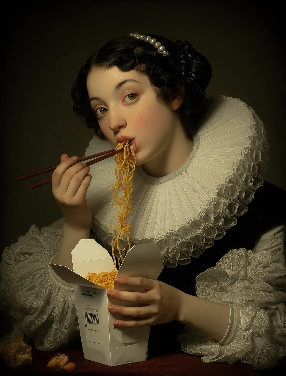 A woman with black hair and gray eyes wearing an elaborate white ruff collar, eating steaming noodles with wooden chopsticks in her right hand while her left hand holds a classic white Chinese takeout carton with the lid folded back, a few noodles draping over the rim, lips gently parted, three quarter view, clean neutral background, rich oil texture, soft museum lighting, subtle chiaroscuro, intricate fabric detail, lifelike skin, baroque color palette, painted in the style of the old masters.