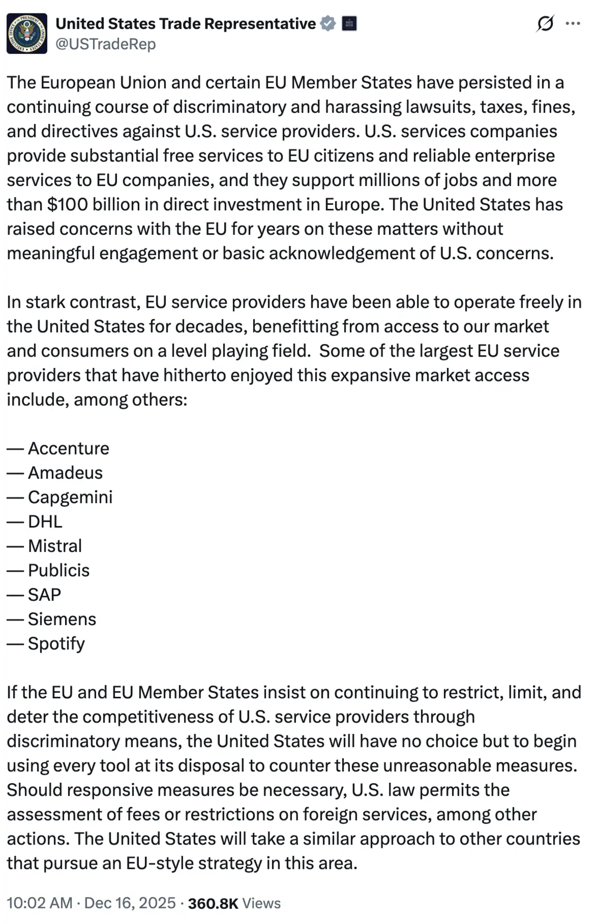 The trigger was a €120 million fine EU regulators imposed on Elon Musk's X platform on December 11 for violating Digital Services Act transparency requirements. Weeks earlier, on September 18, Brussels issued Google a €2.95 billion penalty for anti-competitive search manipulation. The Trump administration responded by threatening not the specific companies facing enforcement but an arbitrary list of European firms with no connection to the underlying disputes.