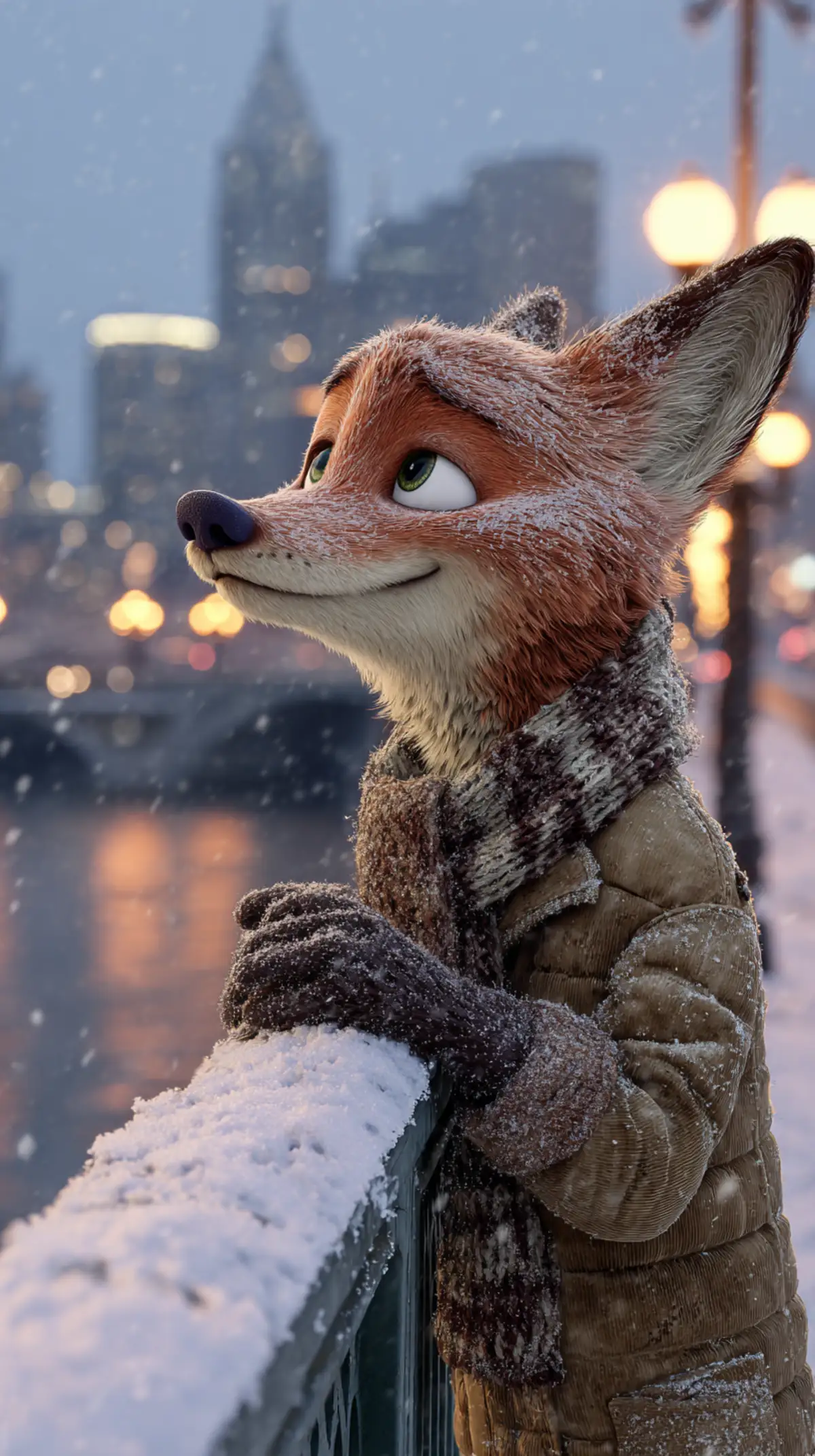 Anthropomorphic fox (Nick Wilde from Zootopia) leaning on a snow-covered bridge railing in a winter city, wearing a brown puffy down jacket, thick knitted scarf and gloves; snowflakes falling, snow dusted on fur and clothing, frozen river surface in the background, snow-capped urban skyscrapers and warm glowing street lamps; cool winter atmosphere with soft cold-toned lighting; Disney animated movie style, highly detailed fur textures, cinematic composition, 8K, realistic rendering