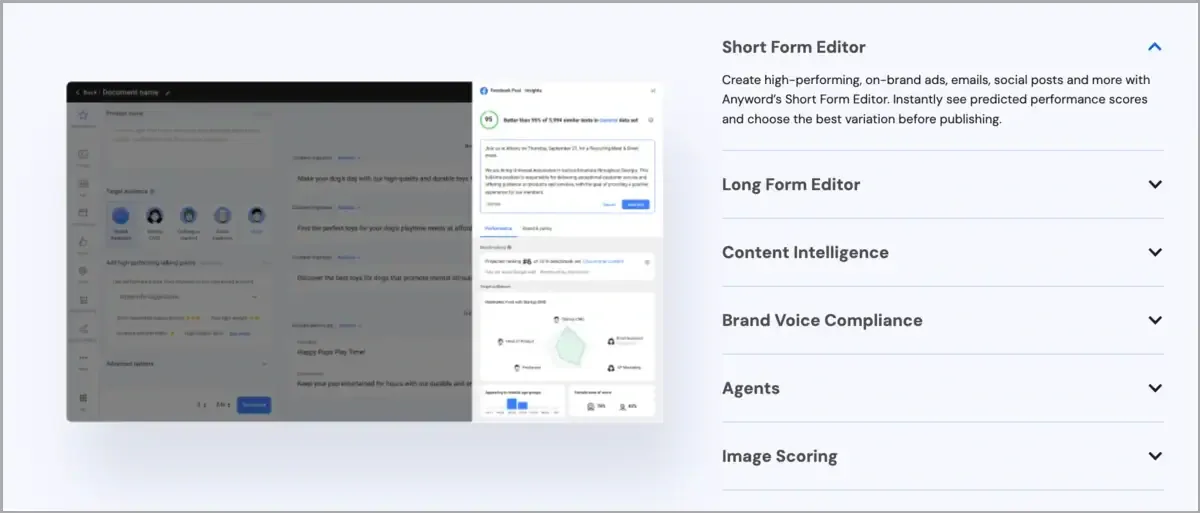 Anyword is an AI copywriting platform that creates optimized marketing content across all channels, from ads and emails to blog posts and landing pages. Its standout feature is the Predictive Performance Score, which analyzes your copy and predicts how well it will convert before you publish. Trained on billions of marketing data points, it helps you choose the best-performing content variations with 82% accuracy.