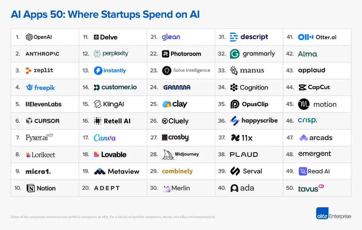 The ranking covers 50 AI-native application companies across a three-month snapshot. Twelve names appear on both the consumer Top 100 and this enterprise-spend list, often in different order. ElevenLabs landed #5 on spend, signaling that startups pay for polished synthetic audio even if attention flows elsewhere. Midjourney appears on both lists, but most of its revenue remains consumer-led. Context matters.