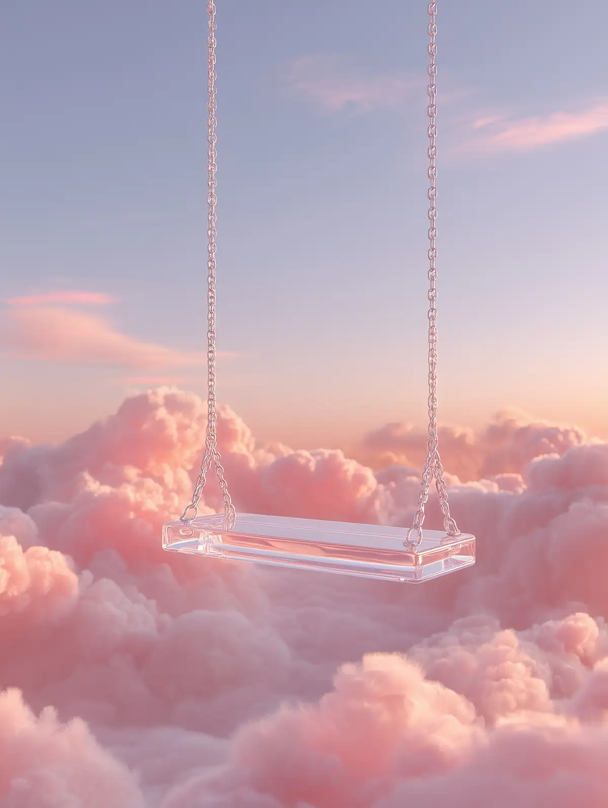 Prompt: a transparent acrylic swing hanging in the air, soft pastel sky background, dreamy clouds, minimal composition, pink and peach gradient sky, soft lighting, glossy plastic material, subtle reflections, aesthetic, surreal mood, centered composition, ultra clean, 3D render, high detail --ar 3:4 --raw